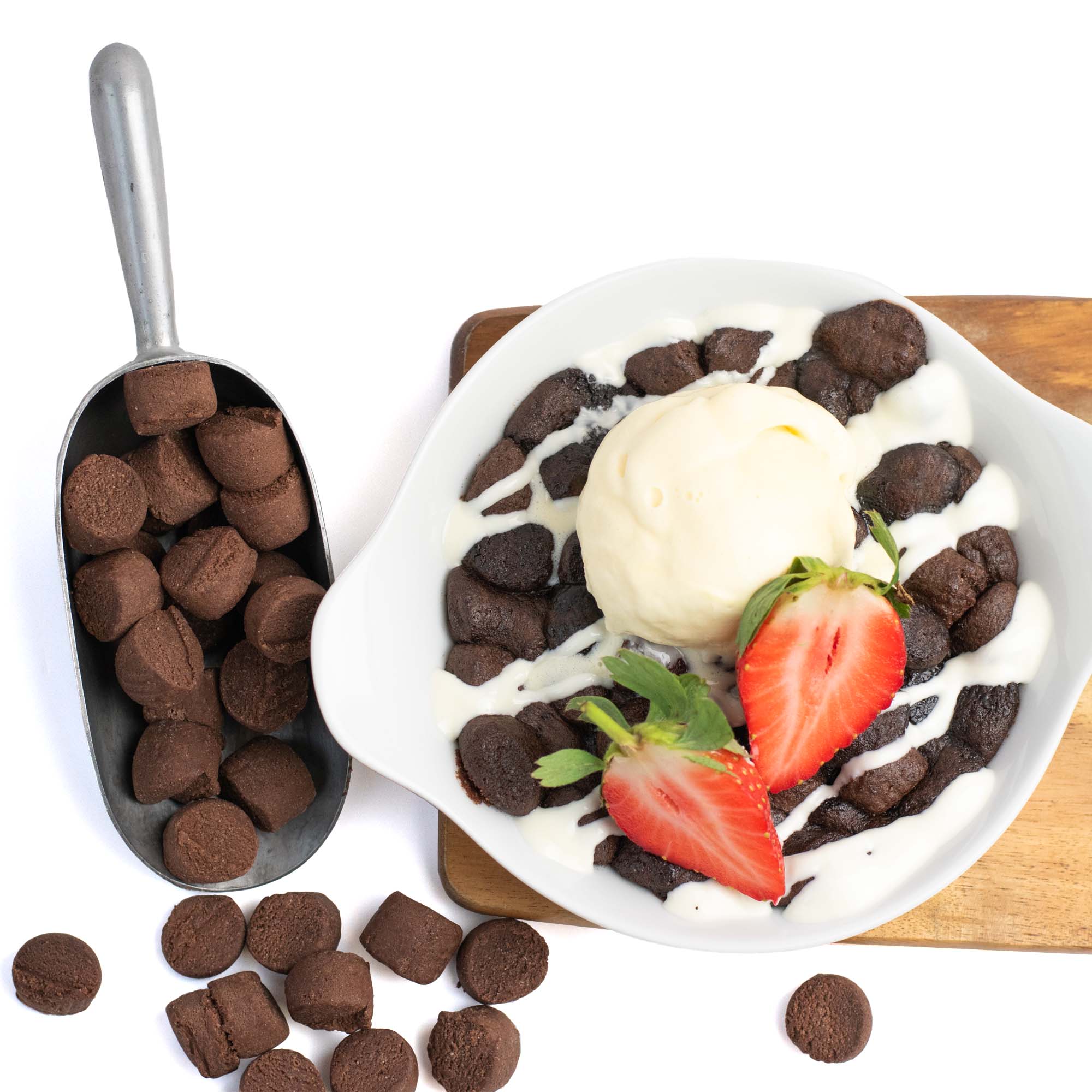 Dark brown brownie cookie dough pieces, approximately 19mm diameter