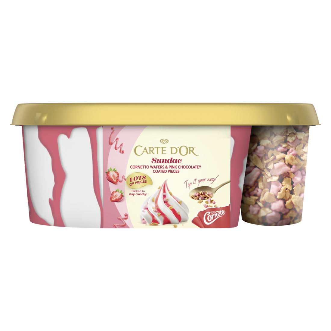 Luxurious Strawberry Sundae ice cream, swirls of smooth creamy vanilla ice cream and sweet, delicious juicy strawberry sauce, with a generous helping of sweet crunchy Cornetto wafer pieces and pink chocolate coated pieces