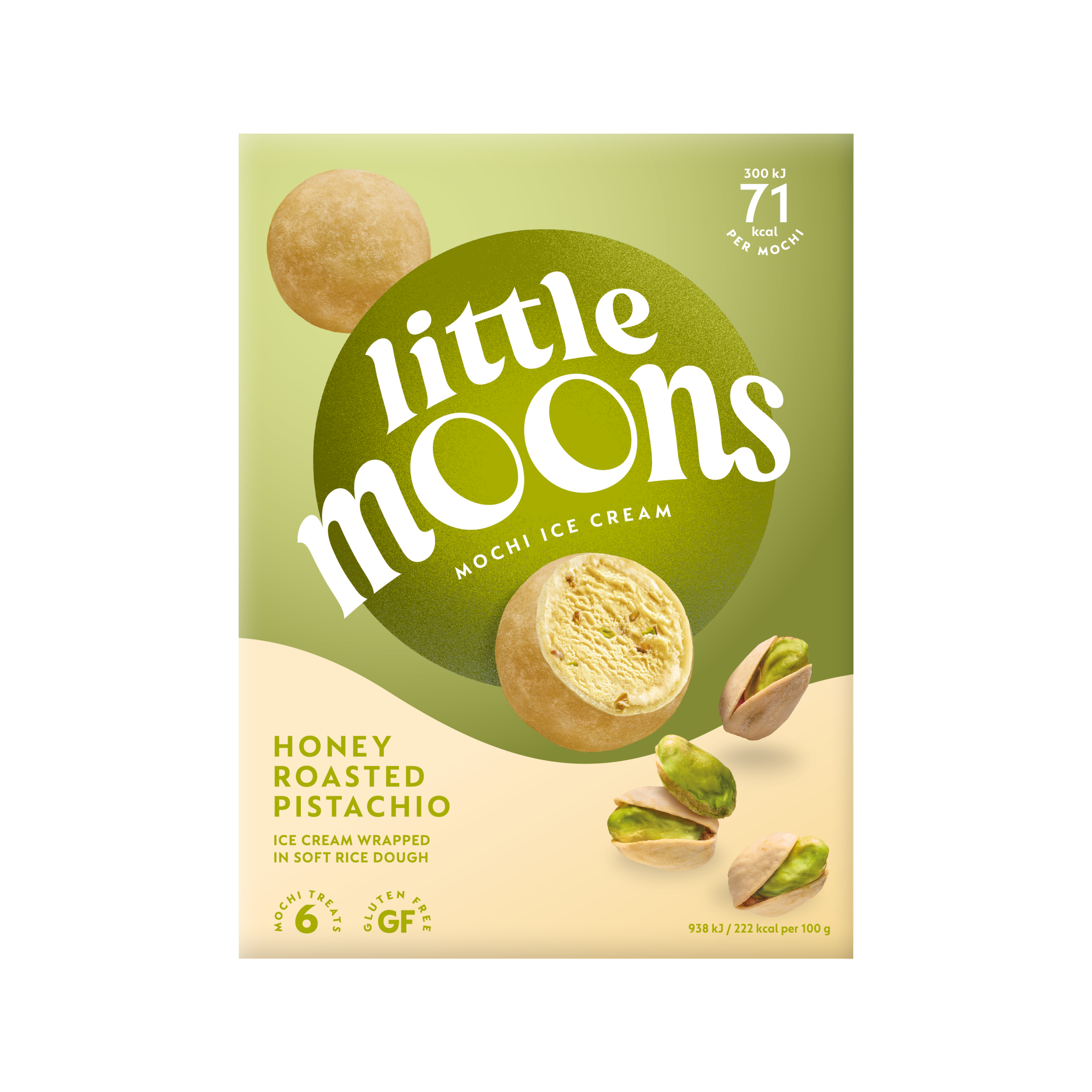 With a mouthful of creamy artisan gelato, lovingly wrapped in soft and delightfully delicate mochi dough, each bite of mochi serves up an exciting new flavour adventure. Discover the sweet nuttiness of pistachios roasted in honey and welcome a whole new world of flavour into your home. Some ice creams can consist of up to 90% air, not ours. The higher density of our gelato means it's not as soft straight out the freezer but results in a more intense flavour with patience. Enjoy the little things. Bite sized adventures, 80 joyful calories per ball, Nutty perfection, Enjoy the little things, No artificial flavourings, colours or preservatives, Dietary gluten free, Suitable for vegetarians. Ingredients: Whole MILK, sugar, water, rice flour, double cream (MILK), trehalose*, PISTACHIO (3.7%), honey roasted PISTACHIO (2.9%) (sugar, PISTACHIO, honey), skimmed MILK powder, tapioca starch, spinach powder, emulsifier (mono and diglycerides of fatty acids), stabilisers (guar gum, locust bean gum, cellulose gum, carrageenan), salt, colours (annatto norbixin, curcumin, copper complexes of chlorophyllins), SOYA. Allergy Information: May also contain other NUTS, PEANUTS & SESAME.