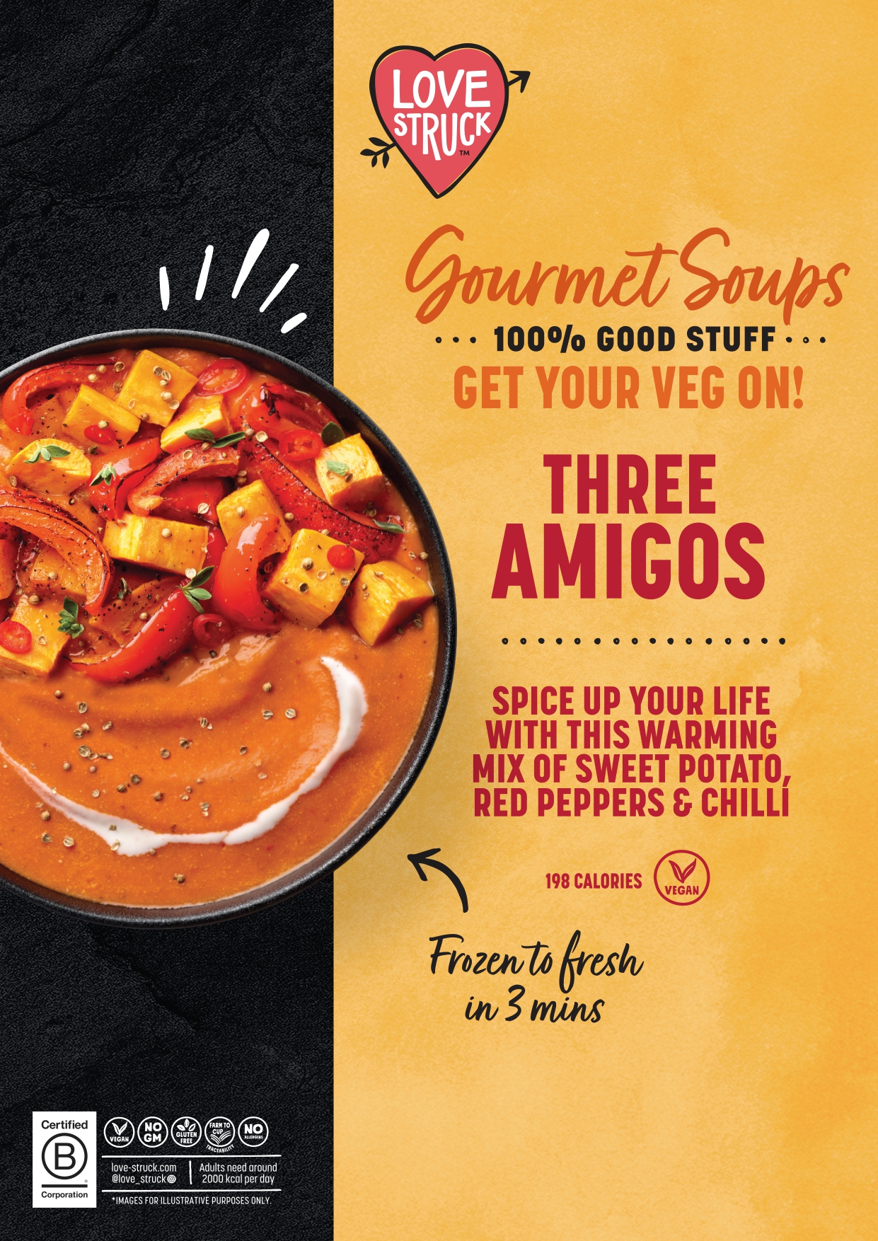Roasted Sweet Potato, Roasted Red Pepper, Red Grapes, Coconut Milk Pellets, Garlic & Salt Pellets (Coconut Oil, Garlic, Salt), Chilli Pellets, Mexican Herb Pellets (Grilled Red Pepper, Garlic, Onion (Onion, Rapeseed Oil), Coriander, Tomato Paste, Cumin, Red Chilli Pepper, Coriander Seed Powder, Onion Powder, Oregano, Salt, Lime Juice, Sugar, Cinnamon, Natural Aroma).