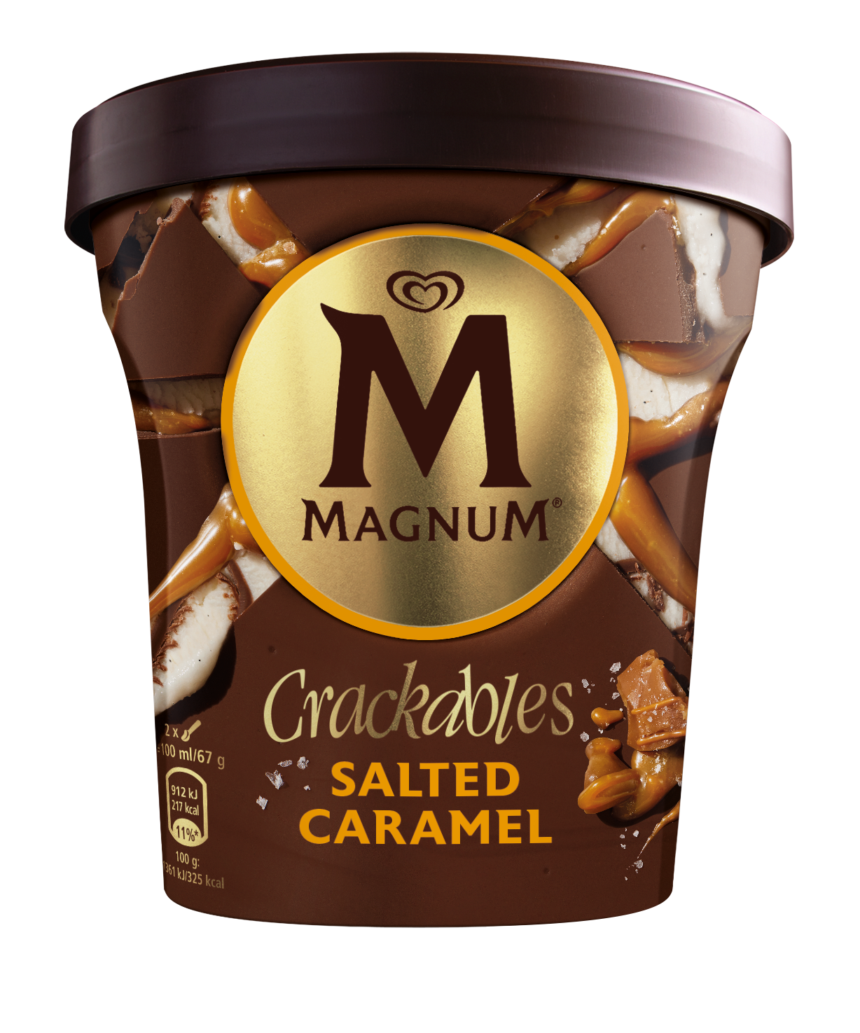 Vanilla ice cream with salted caramel sauce (11%), salted sugar pieces (1%) and milk chocolate shell and shards (22%)