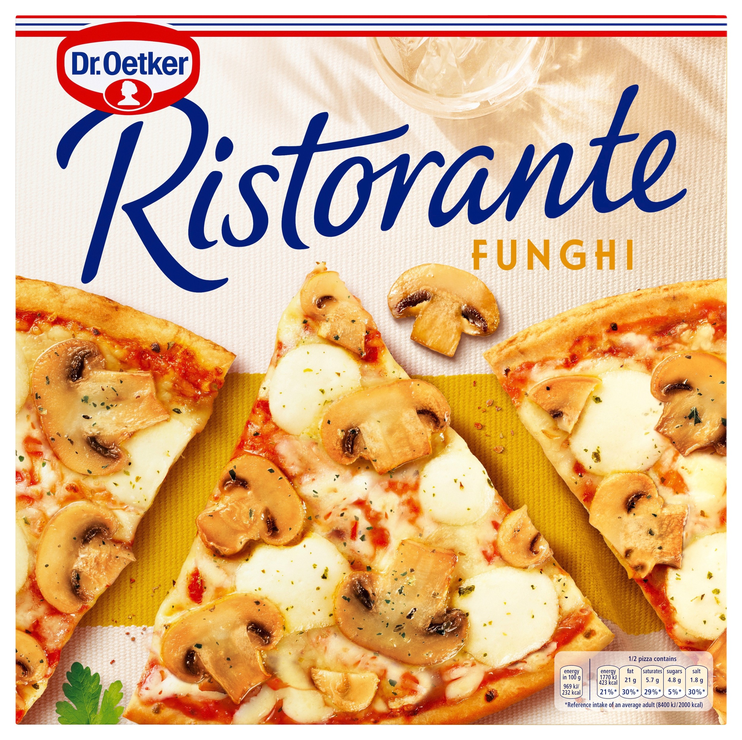 Frozen pizza richly topped with mushrooms, Edam and mozzarella cheese on a thin and crispy base.